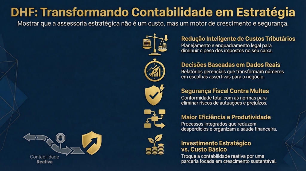 A DHF Assessoria Contábil atua com foco estratégico, ajudando empresas a reduzir custos, organizar sua gestão financeira e se preparar para as mudanças tributárias dos próximos anos.