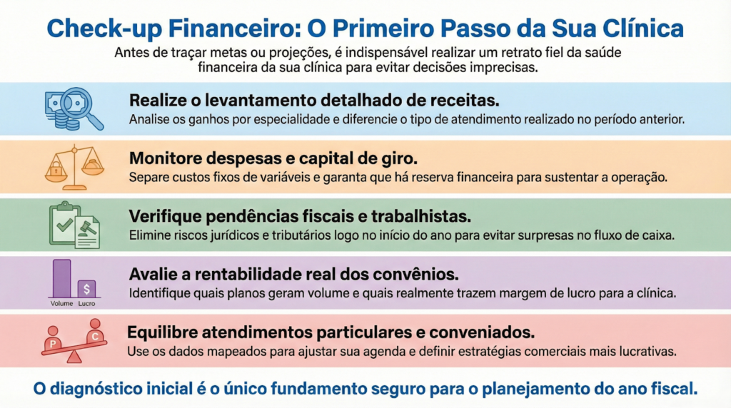 Na gestão financeira para clínicas no início do ano, o diagnóstico inclui: